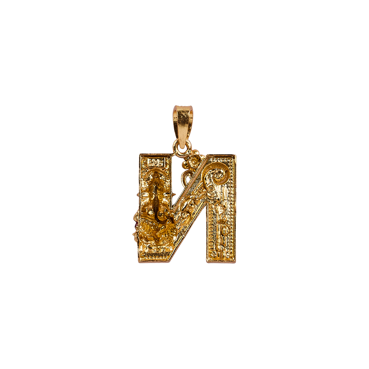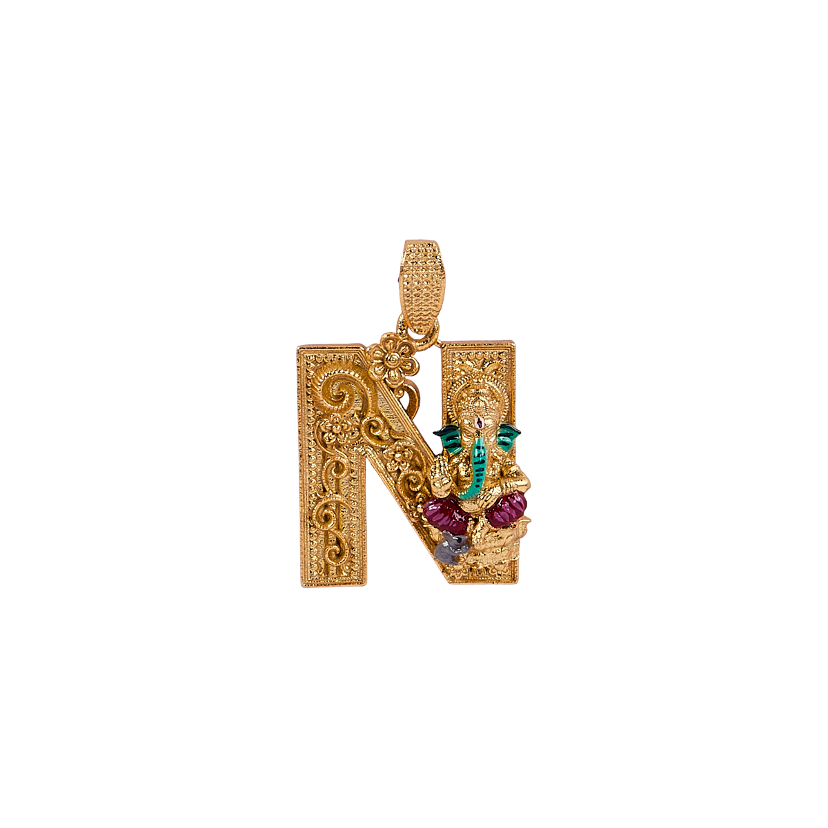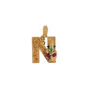 A gold-polished 925 sterling silver pendant featuring the letter N adorned with an intricately detailed Lord Ganesha motif, accented with vibrant enamel and gemstones. Symbolizing wisdom, prosperity, and obstacle removal, this handcrafted piece exudes divine elegance and craftsmanship.