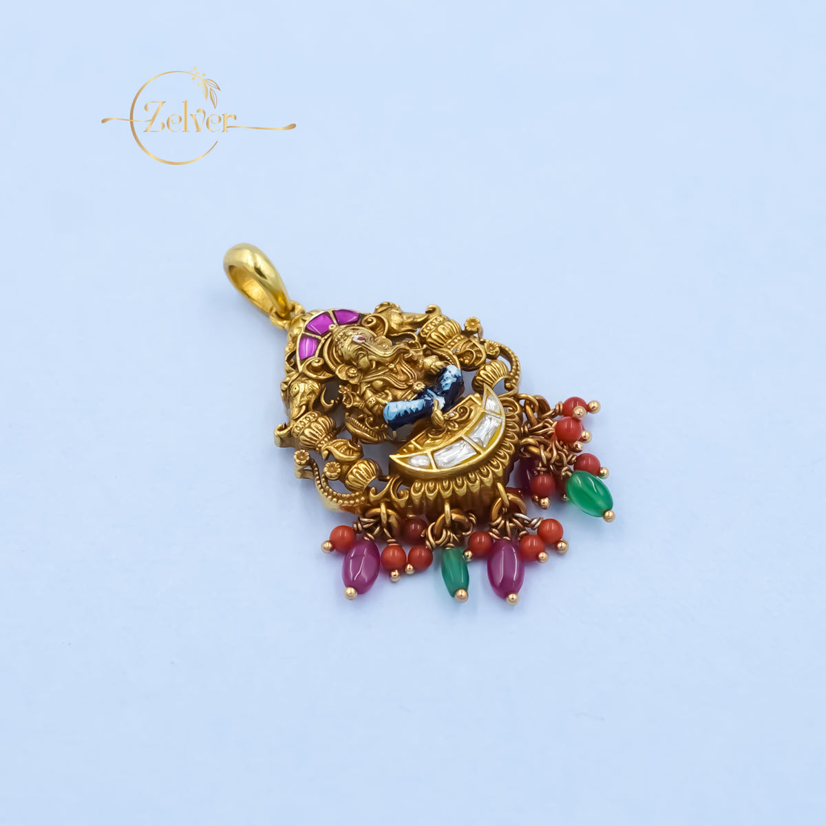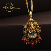 Celebrate tradition and divinity with The Vinayaka Chandrakor Pendant. This exquisite antique-finish piece features Lord Ganesha seated gracefully above a crescent moon (Chandrakor). The crescent is embedded with brilliant clear Swarovski crystals that mimic the look of traditional Polki work. The design is beautifully completed with a cluster of hanging ruby-red and emerald-green beads, adding a vibrant festive touch.
